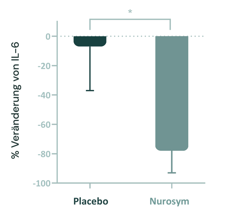 (Abb.). Die Ergebnisse zeigen, dass Nurosym die systemische Entzündung effektiv reduzierte. Insbesondere führte die Vagusnerv-Stimulation zu einem signifikanten Rückgang der Interleukin-6 (IL-6)-Spiegel, mit einer Reduktion von 78,48 % in der Nurosym-Gruppe im Vergleich zu nur 8,63 % in der Kontrollgruppe (p = 0,012) (Parasym Clinical Trials, 2023)