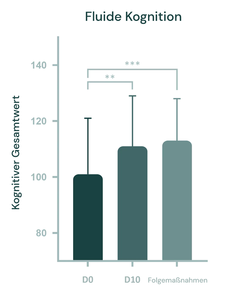 In klinischen Studien wurden die Teilnehmer zu drei wichtigen Zeitpunkten bewertet: Ausgangswert (Tag 0), nach der Intervention (Tag 10) und bei einer Nachuntersuchung nach einem Monat. Die Intervention führte zu signifikanten kognitiven Verbesserungen, wobei die Leistung in der Flanker-Inhibitionskontrolle und Aufmerksamkeit um 11 % und die gesamte Flüssige Kognition um 17 % zunahm.