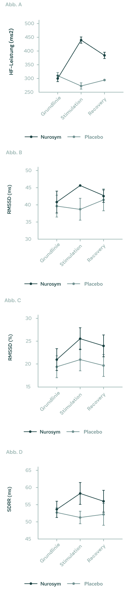 Abb. (A, B, C, D). Die Reaktion der autonomen Funktion, gemessen an der HRV unter Nurosym- oder Placebo-Bedingungen über die Zeit: (A) HF, (B) RMSSD, (C) pRR50, (D) SDRR. Mit Nurosym waren die Messungen von HF, RMSSD, PRR50 und SDRR signifikant höher als die im Placebo (Parasym-Klinische Studien, 2022).
