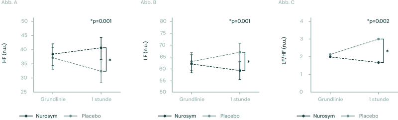 Abb. (A, B, C). Die Abbildungen veranschaulichen Veränderungen in der Herzfrequenzvariabilität (HRV) während der Nurosym Neuromodulation. In Abbildung (A) steigt die Hochfrequenz-HRV signifikant an (*p=0,001). In Abbildung (B) sinkt die Niedrigfrequente HRV signifikant (*P=0,001). Abbildung (C) zeigt, dass das Verhältnis von LF zu HF signifikant verringert ist (*p=0,002) (Parasym Clinical Trials, 2018).