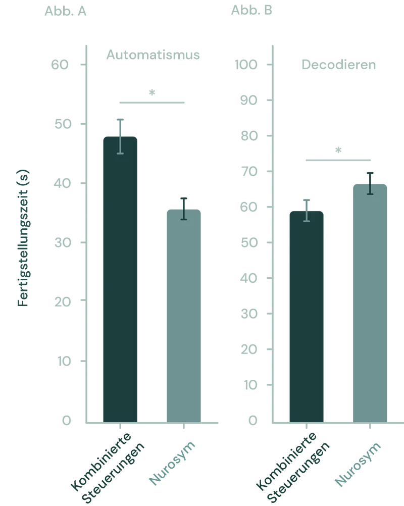 Abb. (A, B). In der Studie verbesserte die Kombination von Nurosym Neuromodulation mit Training die Geschwindigkeit in der Automatisierungs-Lernaufgabe signifikant (*p<0,05) im Vergleich zu Placebo-Kontrollen. Zusätzlich verbesserte die Nurosym Neuromodulation signifikant die Genauigkeit, gemessen am Prozentsatz der korrekten Antworten, in der Dekodierungs-Lernaufgabe im Vergleich zu den Kontrollgruppen (*p < 0,05) (Parasym Clinical Trials, 2020).