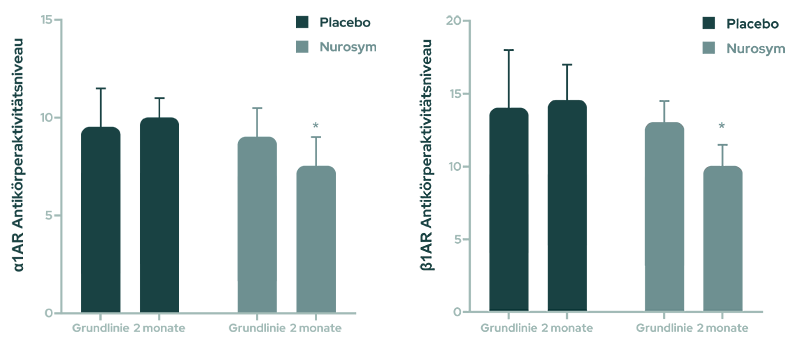 (Abb.). Die Werte der anti-autonomen Autoantikörper, insbesondere α1-adrenerger Rezeptor (α1-AR) und β1-adrenerger Rezeptor (β1-AR), waren in der aktiven Gruppe signifikant reduziert (p<0,05) (Parasym Clinical Trial, 2023).