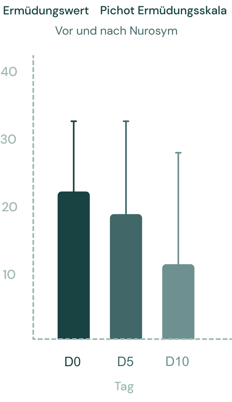 Abb. Die Pichot-Müdigkeitsskala-Werte während der Nurosym-Therapie (D0: Tag 0, D5: Tag 5 und D10: Tag 10). Eine signifikante Verbesserung der Müdigkeitswerte nach der Nurosym-Behandlung wurde beobachtet (D0 vs. D10, p<0,0001). (Parasym klinische Studie, 2021)