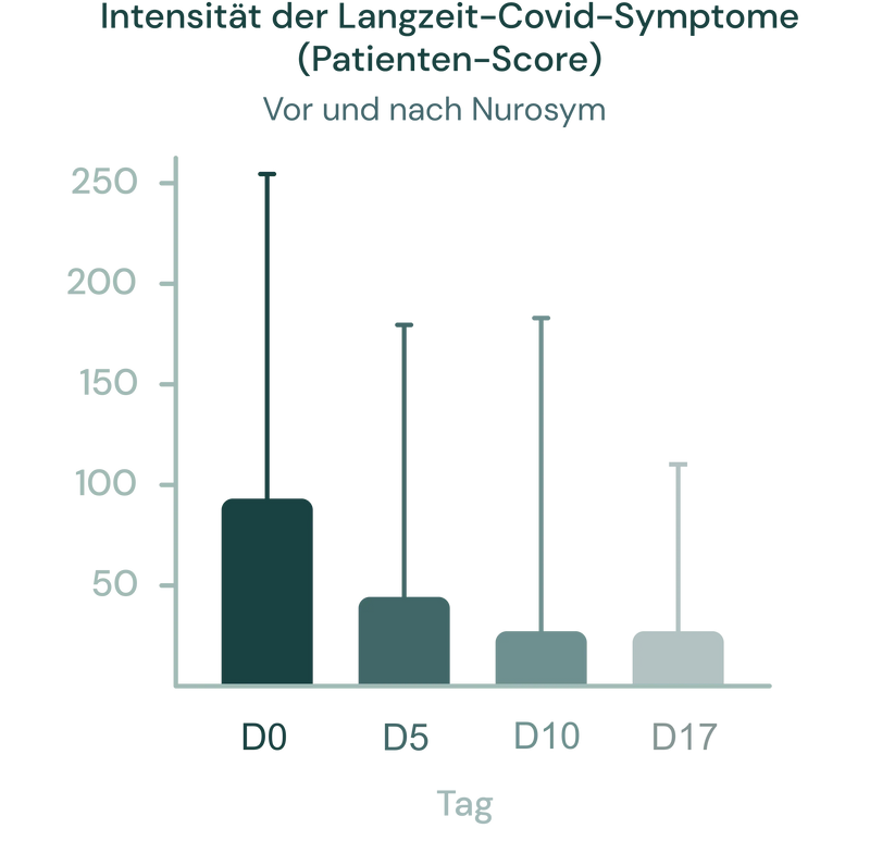 Ein weiteres Ergebnis von Nurosym hebt eine signifikante Remission post-viraler Symptome hervor, insbesondere die Linderung von chronischer Müdigkeit, Gehirnnebel, Schmerzen und Depressionswerten bei allen in die Untersuchung eingeschlossenen Long-COVID-Patienten um 40%.