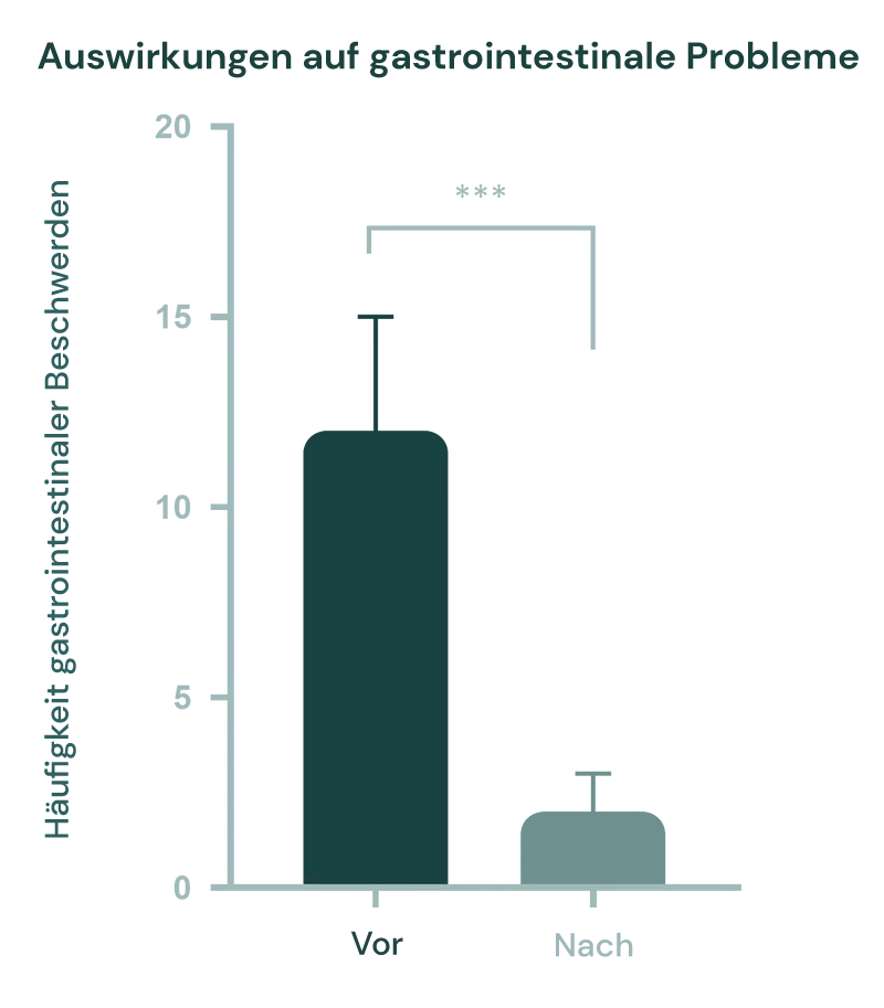 (Abb.) eine signifikante Reduktion der Häufigkeit von gastrointestinalen (GI) Problemen über einen 10-tägigen Behandlungszeitraum. Vor der Behandlung lag die Häufigkeit von GI-Problemen im Durchschnitt bei 10. Nach 10 Tagen Behandlung gab es einen erheblichen Rückgang der Magen-Darm-Probleme, die auf einen Durchschnitt von unter 2 sanken (Parasym Clinical Trial, 2021).