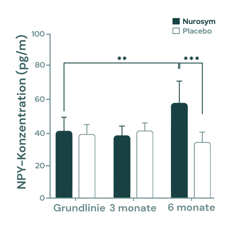 Nurosym Neuromodulation hilft, Neuropeptid Y (NPY) aufrechtzuerhalten (38% niedrigere Werte im Vergleich zur Placebogruppe), was zu einer verringerten sensorischen Nervenaktivität im Vergleich zu Placebo führt und folglich Bauchschmerzen und Unwohlsein reduzieren kann.