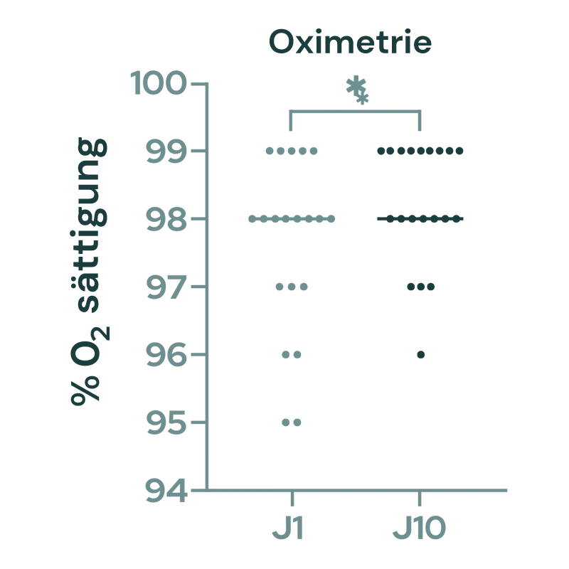 Abbildung 6. Entwicklung der arteriellen Blutsauerstoffsättigung vor und nach der Behandlung (in % O2 arterielle Blutsättigung). Die Mittelwerte wurden mit einem gepaarten t-Test verglichen (Parasym Clinical Trial, 10.51956/ANNR.100011).