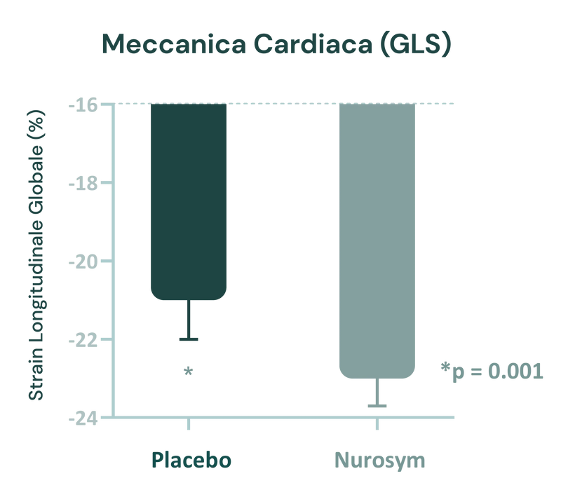 Nach 3 Monaten Nurosym-Behandlung wurde eine Verringerung der Deformation des Herzmuskels (höherer GLS) um ~19% im Vergleich zur Kontrollgruppe beobachtet. Diese Verbesserung war mit einer Reduktion der Risikofaktoren für Herz-Kreislauf-Erkrankungen verbunden, was besonders wichtig für Profisportler ist, wenn ein erhöhtes Risiko für Herzdeformationen besteht, insbesondere bei Bodybuildern.