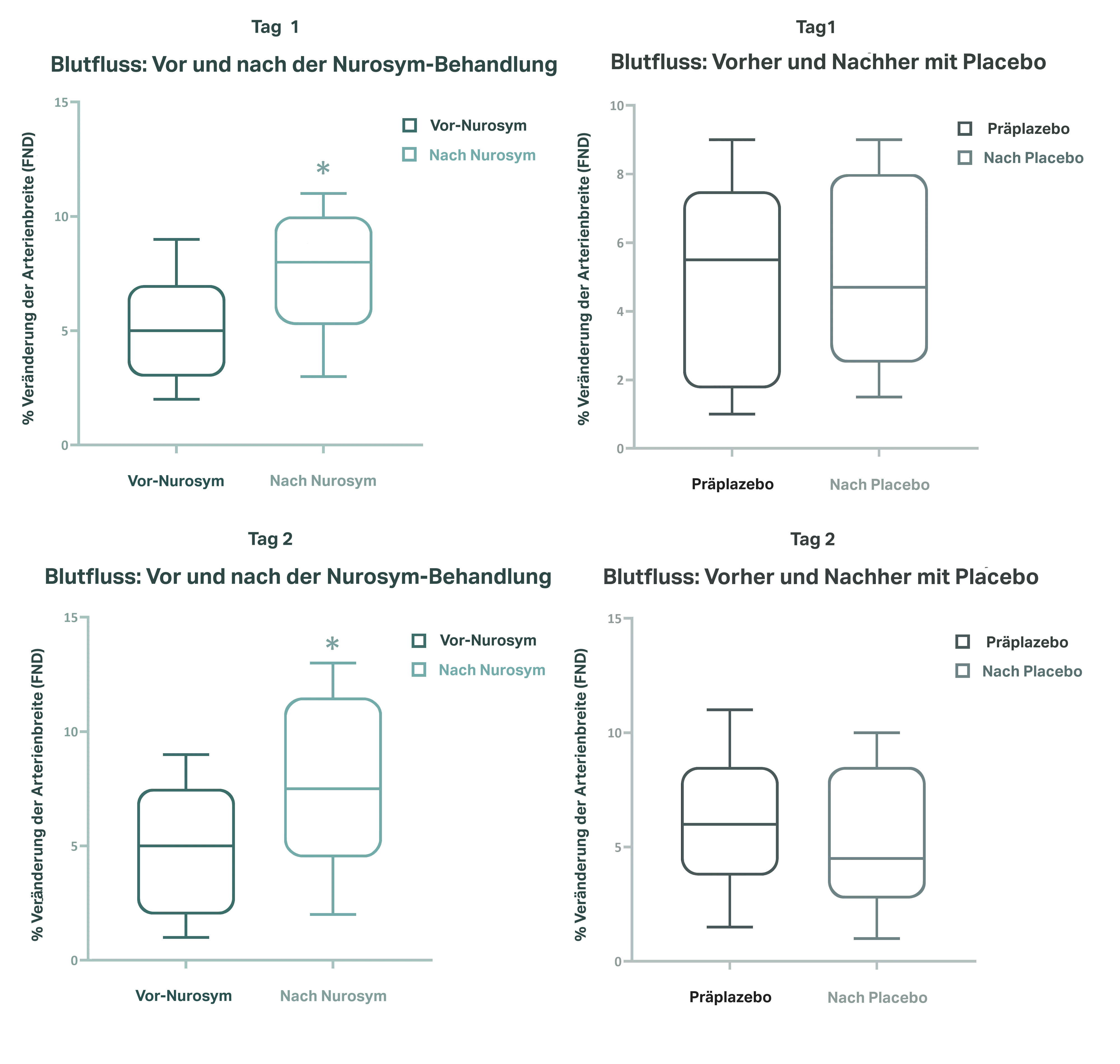 Nurosym verbesserte die flussvermittelte Dilatation (FMD), indem es die prozentuale Veränderung des Durchmessers der Arteria brachialis um 50 % steigerte, was auf einen signifikanten positiven Effekt auf die makrovaskuläre Endothelfunktion (p = 0,02 an Tag 1; p = 0,003 an Tag 2) im Vergleich zur Stimulation durch Placebo (p = 0,84 an Tag 1; p = 0,65 an Tag 2) hindeutet.
