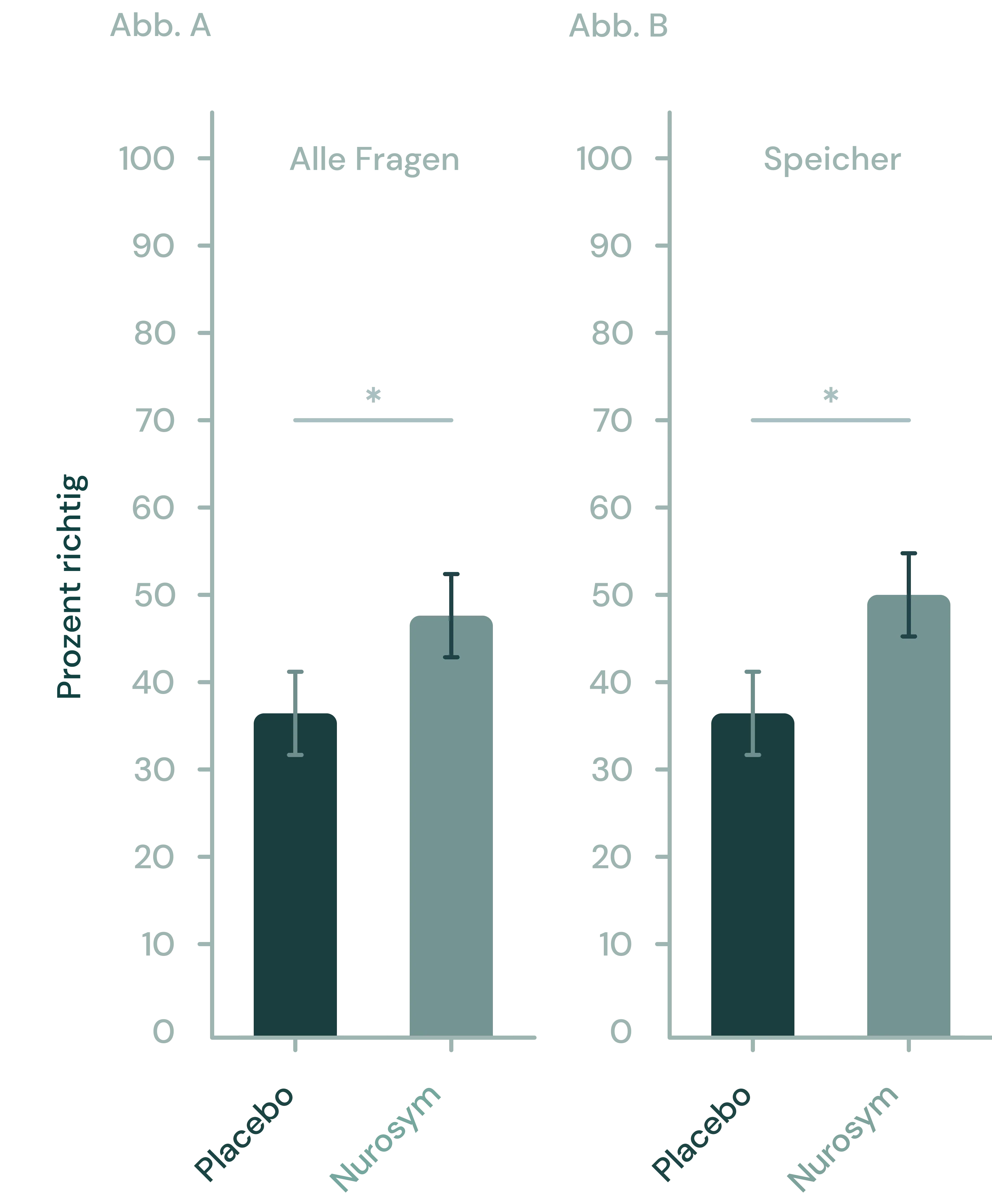 Bei Fragen zum Gedächtnis zeigte die Aktivgruppe eine signifikant höhere Genauigkeit als die Placebogruppe (32 %, p = 0,007). In der Nurosym-Aktivgruppe gab es eine signifikante positive Korrelation zwischen dem verbalen Arbeitsgedächtnis und den Gedächtnisfragen (p = 0,023), während in der Placebogruppe keine derartige Korrelation bestand. Darüber hinaus wurde in der gesamten Stichprobe kein signifikanter Zusammenhang zwischen den Zahlen- und Buchstabenwerten des Arbeitsgedächtnisses und den Werten bei den Gedächtnisfragen festgestellt (p = 0,54).