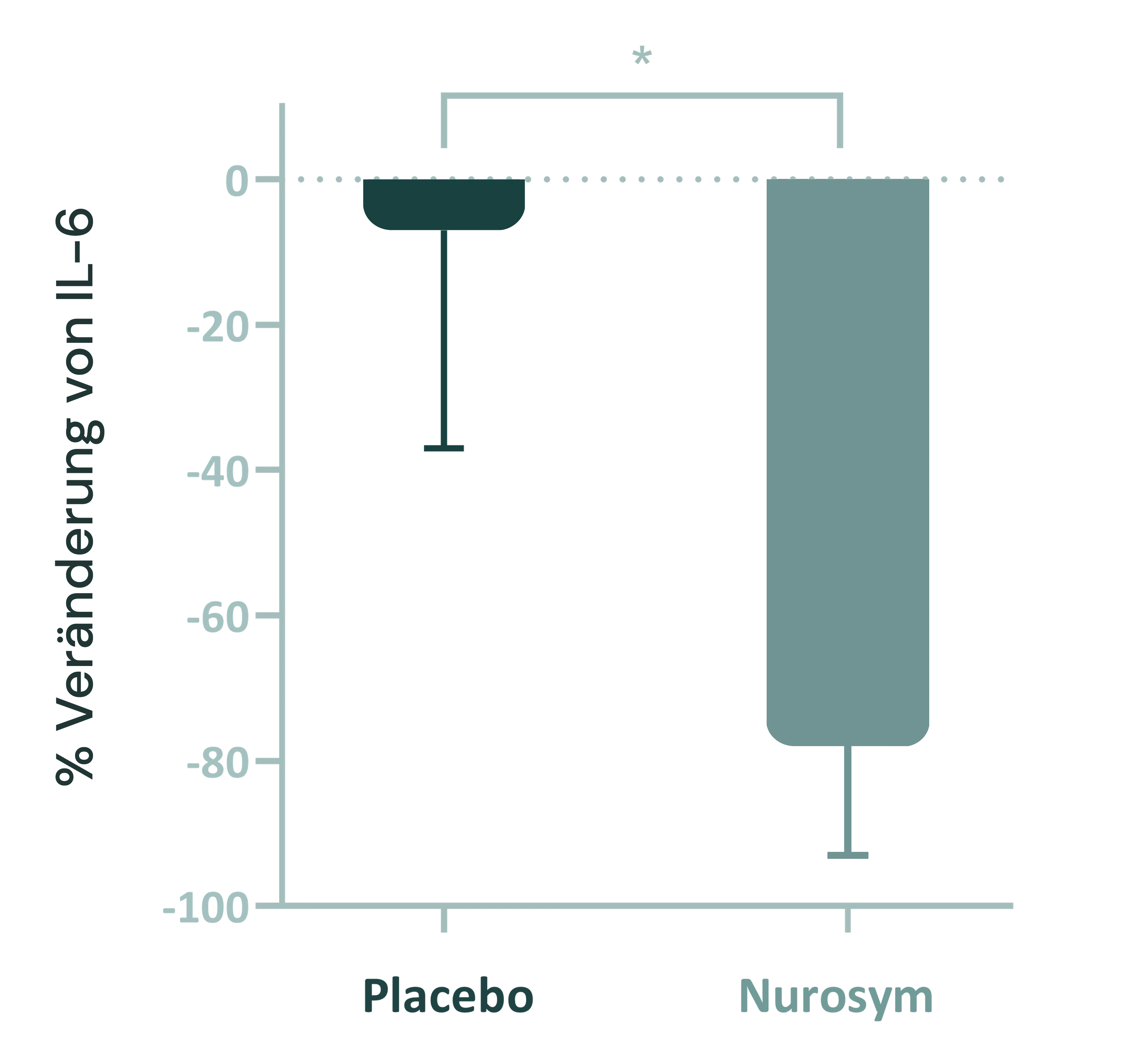 Die Ergebnisse zeigen, dass Nurosym die systemische Entzündung deutlich abschwächt. Insbesondere führte die Stimulation des Vagusnervs zu einer signifikanten Senkung der Interleukin-6 (IL-6)-Spiegel im Vergleich zur Kontrollgruppe (Nurosym: -78,48% vs. Kontrolle: -8,63%; p = 0,012) (Studie II).