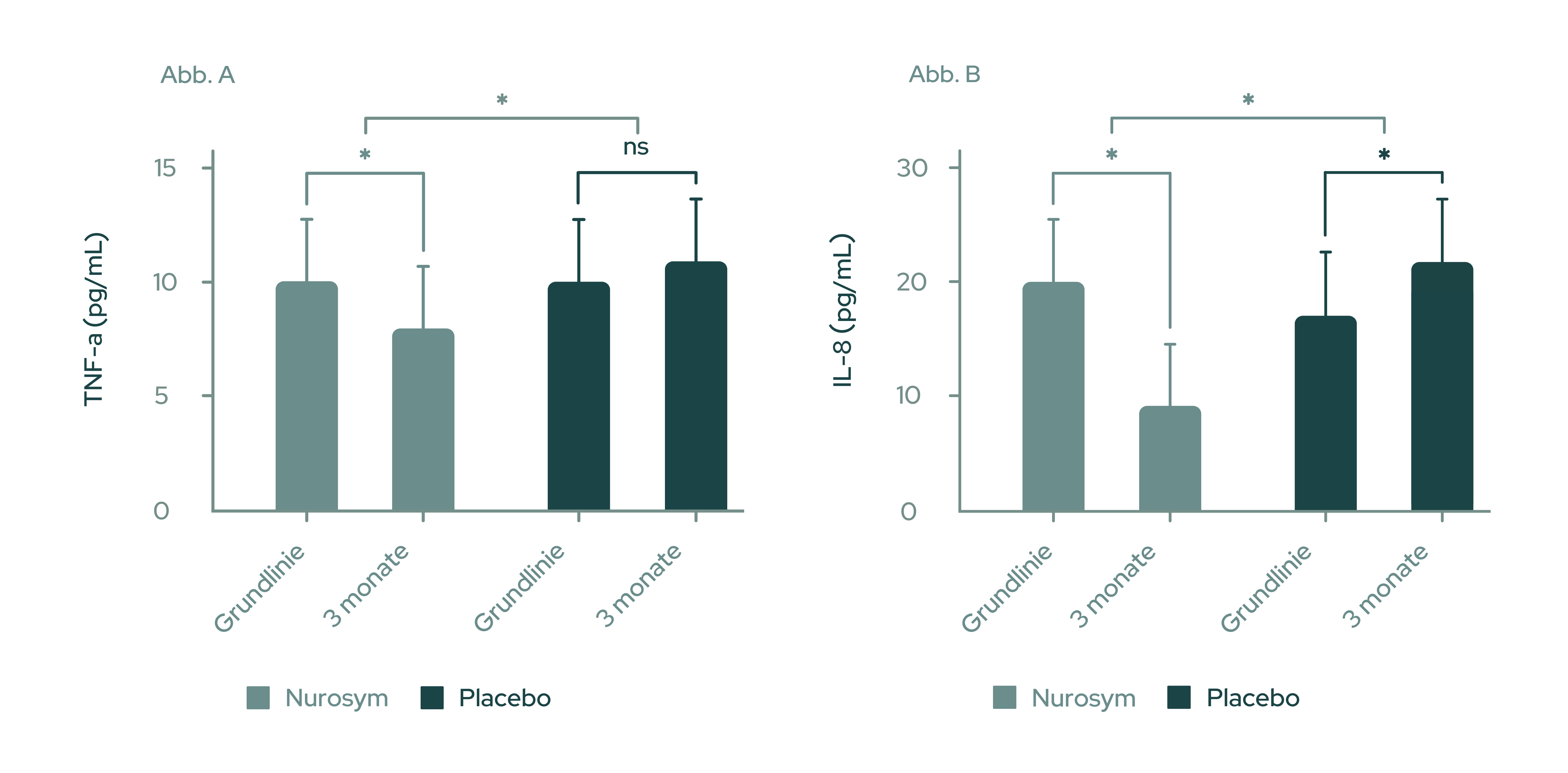 Nurosym veränderte andere Zytokine (TNF-α, Il-8 in Studie I) (IL-6, CRP in Studie II) günstig. Die nach der Behandlung mit Nurosym beobachtete Verringerung des Spiegels entzündungsfördernder Zytokine deutet auf eine Unterdrückung der Entzündungskaskade hin, wodurch die Entzündung und die damit verbundenen schädlichen Auswirkungen auf Gewebe und Organe gelindert werden. Die dauerhafte Verringerung der Entzündung auf lange Sicht erleichterte den Wiederaufbau des Gewebes und verbesserte die Organfunktion. Die Patienten in der aktiven Stimulationsgruppe berichteten auch über eine bessere Lebensqualität. Bemerkenswert ist, dass keine gerätebedingten Nebenwirkungen beobachtet wurden.