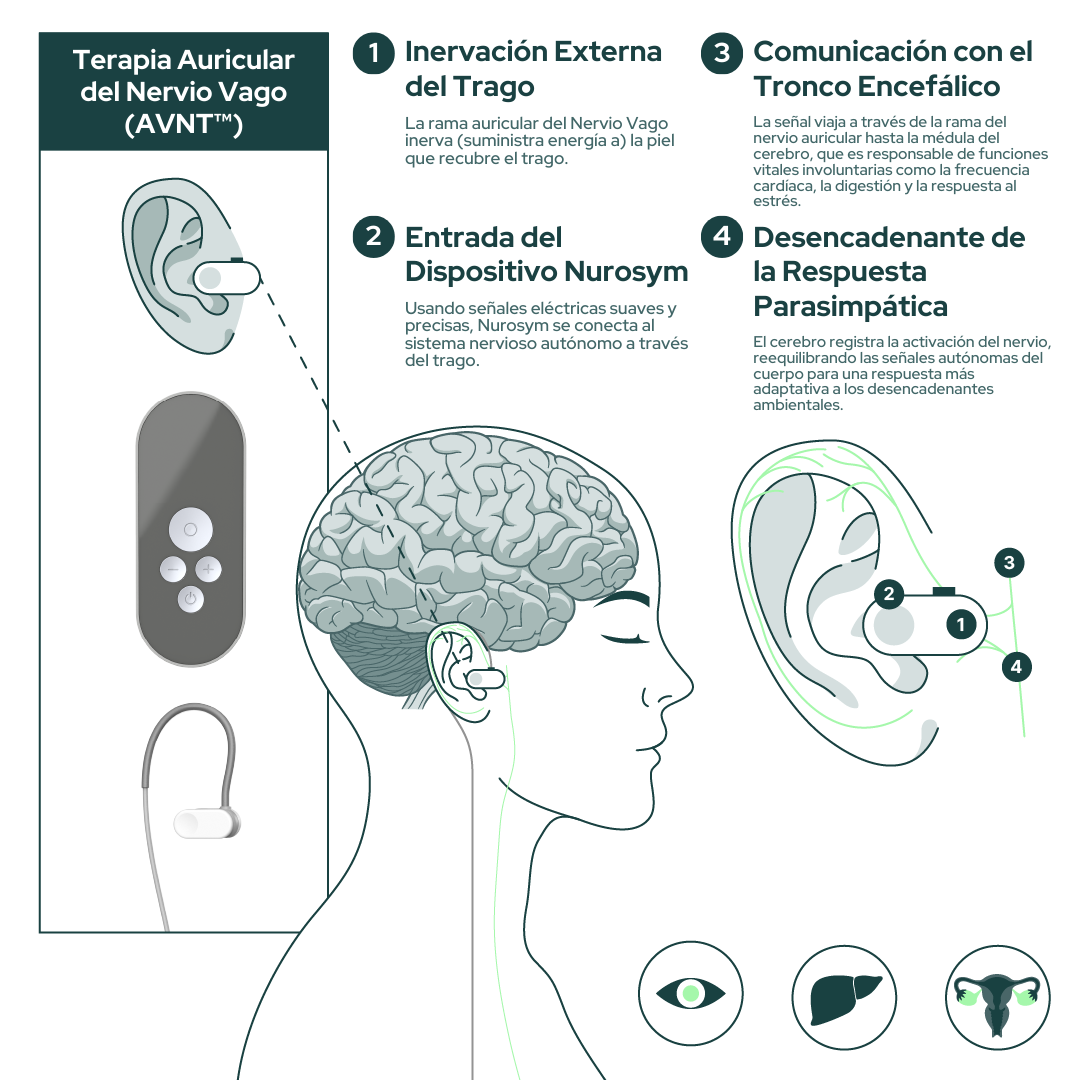 El nervio vago sirve como una autopista de comunicación entre el cerebro y el cuerpo. En individuos con POTS, la reducción del tono vagal puede exacerbar el desequilibrio autonómico, llevando a síntomas como la irregularidad de la frecuencia cardíaca y la ansiedad aumentada. Nurosym funciona al proporcionar una suave estimulación eléctrica al nervio vago a través del trago de la oreja, promoviendo la actividad parasimpática y restaurando el equilibrio.