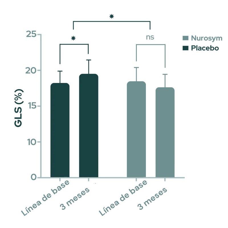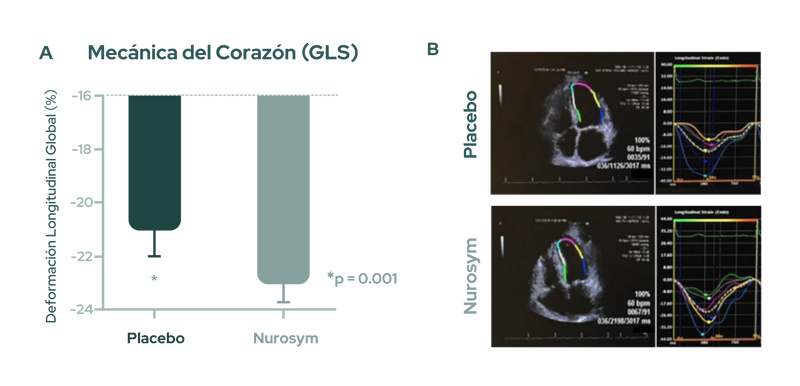 Después de 3 meses de tratamiento con Nurosym, se observó una disminución en la deformación del músculo cardíaco (indicada por una mejora en la deformación longitudinal global (función ventricular izquierda) de aproximadamente ~11% en comparación con el grupo de control), y esta mejora se asoció con una reducción en los factores de riesgo de enfermedad cardiovascular (doi: 10.1161/JAHA.121.023582).