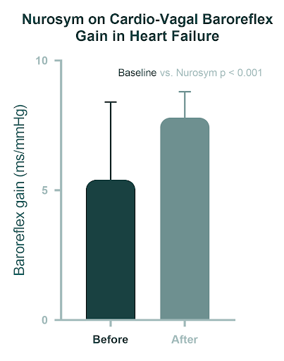 La AVNT del lado derecho aumentó significativamente la ganancia del barorreflejo cardiovagal en un 34 % con respecto al valor basal (∆ 1,9 ± 1,6 ms/mmHg, p < 0,001), superando a la AVNT del lado izquierdo en pacientes con insuficiencia cardíaca crónica. Se realizó un ANOVA unidireccional para medidas repetidas, con corrección de Bonferroni para comparaciones por pares post hoc.