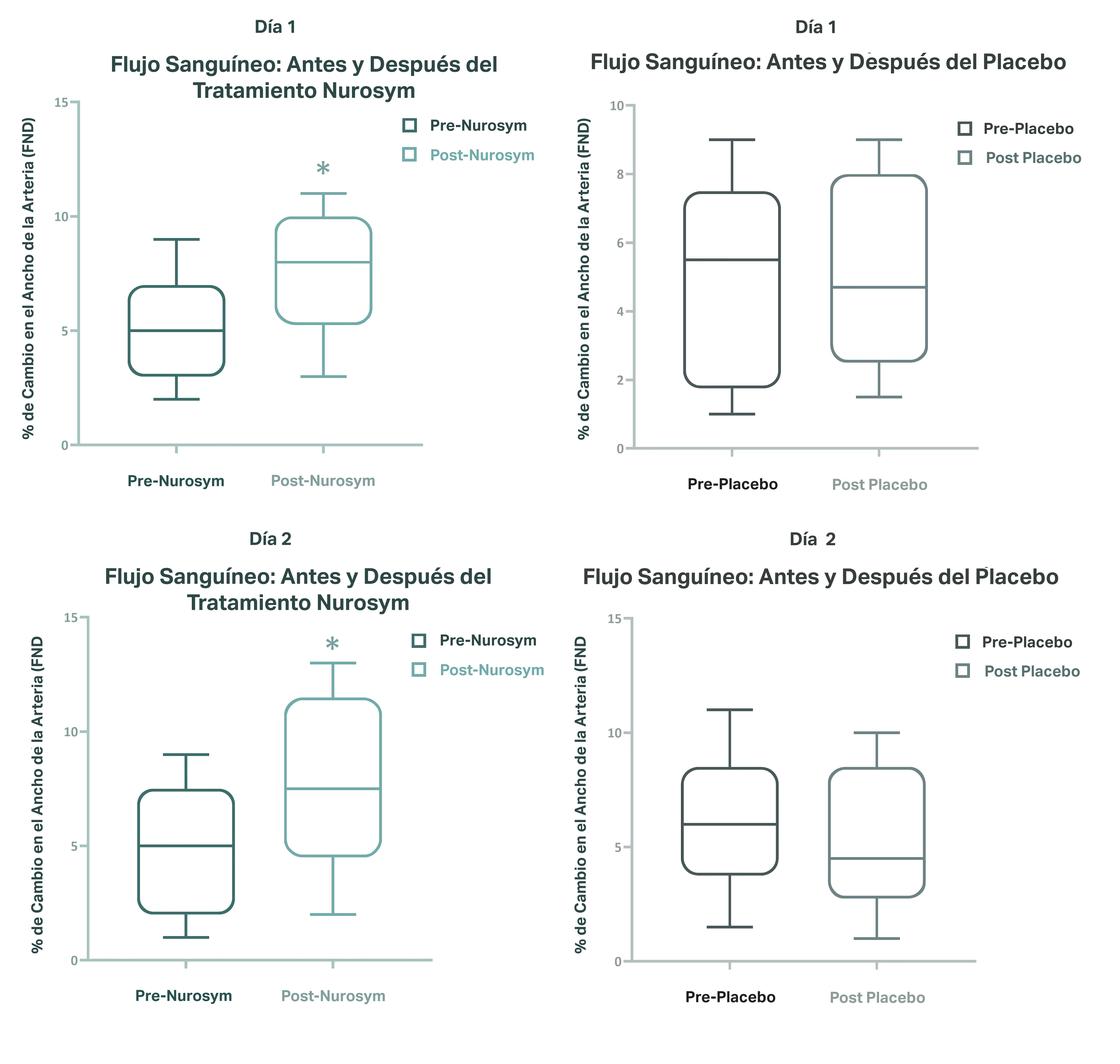 Nurosym mejoró la dilatación mediada por flujo (DMF) aumentando el cambio porcentual del diámetro de la arteria braquial en un 50%, lo que sugiere un efecto positivo significativo sobre la función endotelial macrovascular (p = 0,02 el día 1; p = 0,003 el día 2) en comparación con la estimulación con placebo (p = 0,84 el día 1; p = 0,65 el día 2).