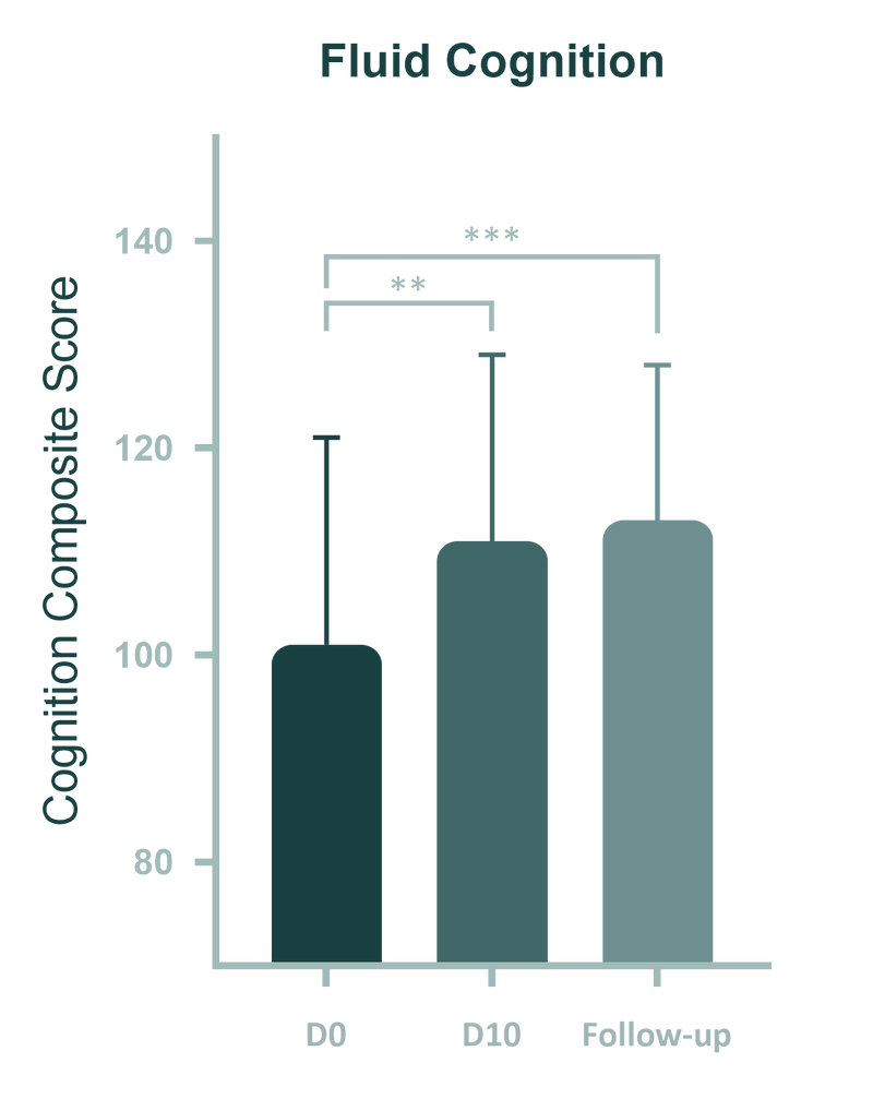 In clinical trials, participants were assessed at three key time points: baseline (Day 0), post-intervention (Day 10), and at a 1-month follow-up. The intervention led to significant cognitive improvements, with performance in Flanker Inhibitory Control and Attention increasing by 11%, and overall Fluid Cognition improving by 17%.