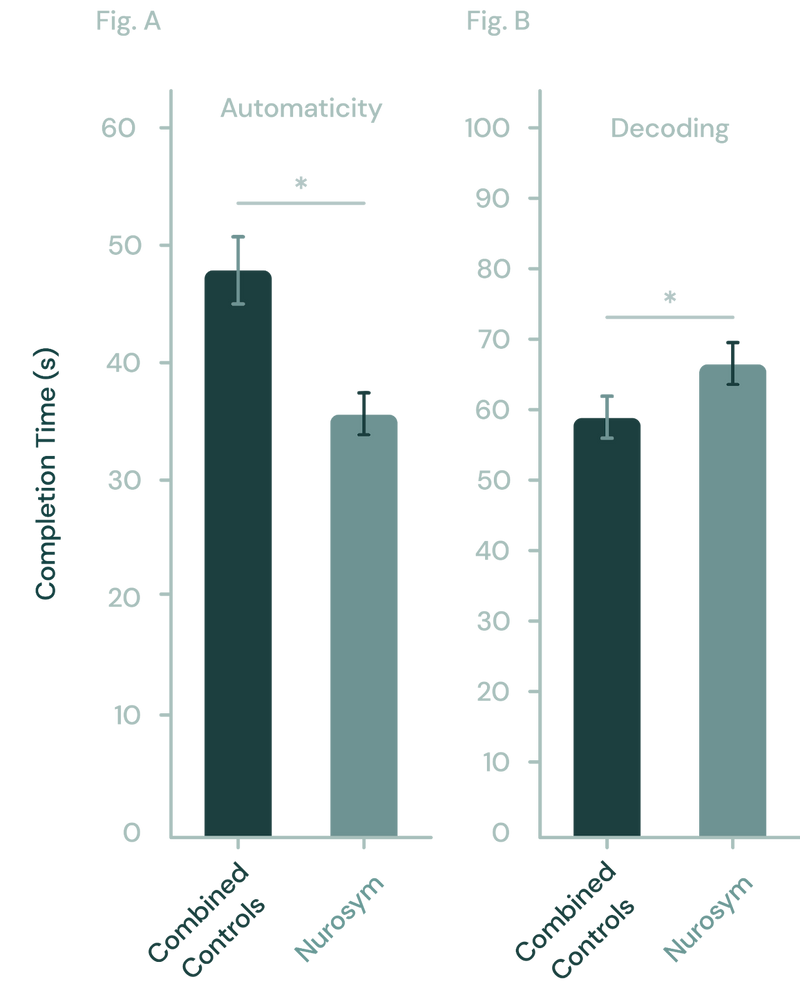 Fig (A, B). In the study, pairing Nurosym neuromodulation with training notably enhanced speed performance in the Automaticity learning task (significantly, *p<0.05), compared to placebo controls. Additionally, Nurosym neuromodulation significantly improved accuracy, as measured by the percent correct, in the Decoding learning task when compared to controls (*p < 0.05) (Parasym Clinical Trials, 2020).