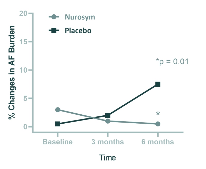 In the Nurosym research, patients with atrial fibrillation (AF) experienced an 85% decrease AF burden measure when treated with Nurosym for 6 months, in contrast to Placebo control group (doi: 10.1016/j.jacep.2019.11.008, 10.1161/JAHA.120.020865).