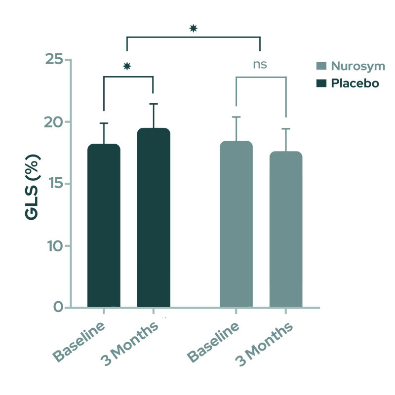 After 3 months of Nurosym treatment, an decrease in deformation of heart muscle (indicated by GLS improvement (left ventricular function) of approximately ~11% was observed compared to the control group, and this improvement was associated with a reduction in cardiovascular disease risk factors (doi: 10.1161/JAHA.121.023582).