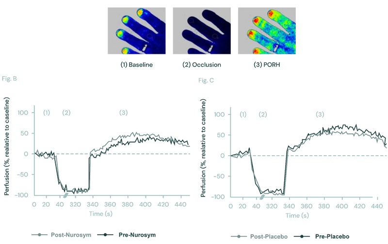 Fig. Effect of the Nurosym neuromodulation on peripheral microcirculation using laser speckle contrast imaging (LSCI). In the LSCI recordings of the left hand dorsum, (1) pseudo colour images showed baseline, (2) occlusion, and (3) post-occlusive reactive hyperemia (PORH) phase. Blue indicated lower, while red indicated higher perfusion rates. Comparing blood perfusion changes over the nail bed area before and after Nurosym neuromodulation (B) and Placebo stimulation (C), significantly higher perfusion rates were observed after Nurosym (Parasym Clinical Trials, doi: 10.1016/j.cardfail.2020.12.017).