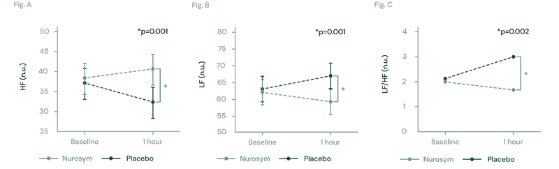 Figure (A, B, C). Le figure illustrano i cambiamenti nella variabilità della frequenza cardiaca (HRV) durante la neuromodulazione Nurosym. Nella Figura (A), l'HRV ad alta frequenza aumenta significativamente (*p=0,001). Nella Figura (B), l'HRV a bassa frequenza diminuisce significativamente (*P=0,001). La Figura (C) dimostra che il rapporto tra LF e HF è significativamente diminuito (*p=0,002) (Parasym Clinical Trials, 2018).