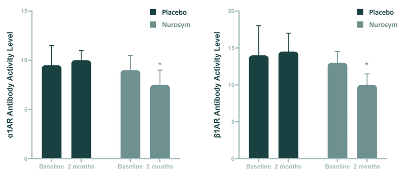 (Fig). I livelli di autoanticorpi anti-autonomia, in particolare del recettore α1-adrenergico (α1-AR) e del recettore β1-adrenergico (β1-AR), sono stati significativamente ridotti (p<0,05) nel gruppo attivo (Parasym Clinical Trial, 2023).