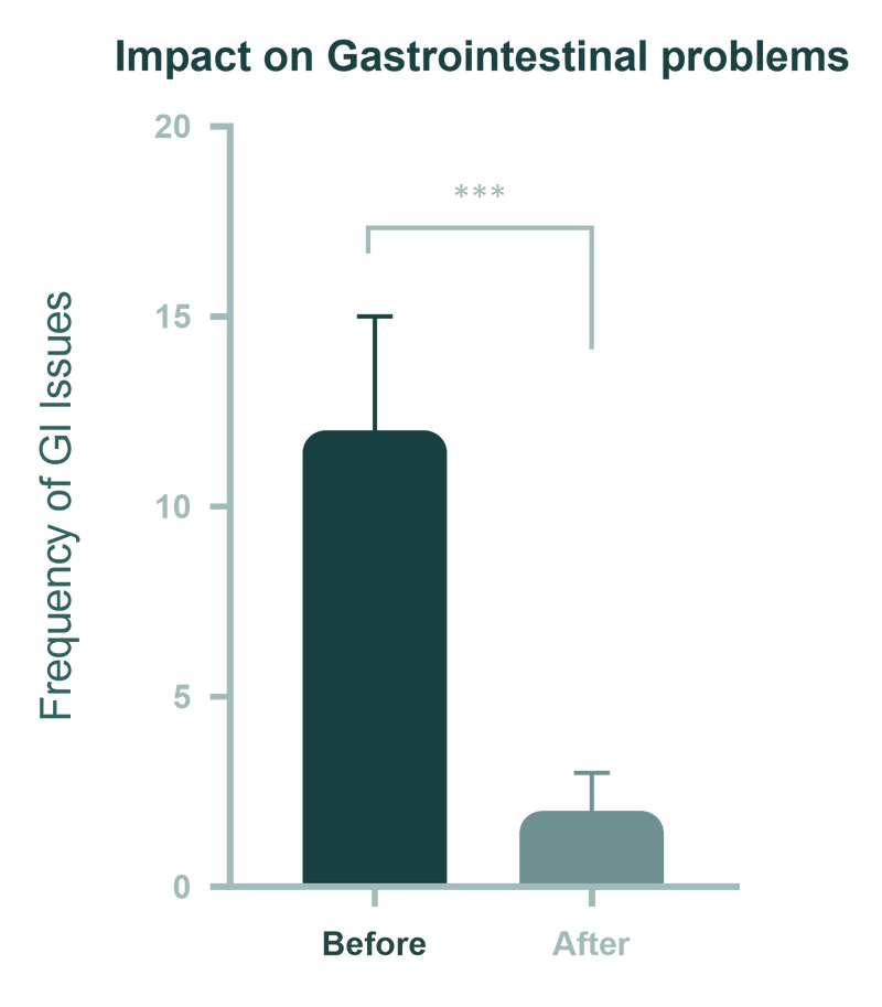 (Fig) una riduzione significativa della frequenza di problemi gastrointestinali (GI) durante un periodo di trattamento di 10 giorni. Prima del trattamento, la frequenza dei disturbi gastrointestinali era in media pari a 10. Dopo 10 giorni di trattamento, si è registrata una sostanziale diminuzione dei problemi gastrointestinali, scesi a una media inferiore a 2 (Parasym Clinical Trial, 2021).