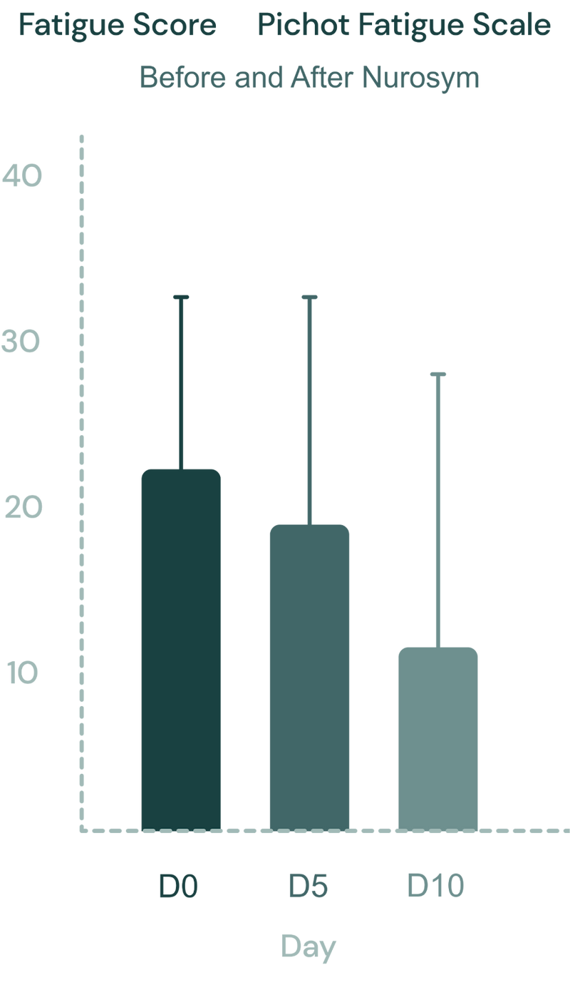 Fig. I punteggi della scala di fatica Pichot durante la terapia con Nurosym (D0: giorno 0, D5: giorno 5 e D10: giorno 10). È stato osservato un miglioramento significativo dei punteggi di affaticamento dopo il trattamento con Nurosym (D0 vs. D10, p<0,0001). (Studio clinico Parasym, 2021)