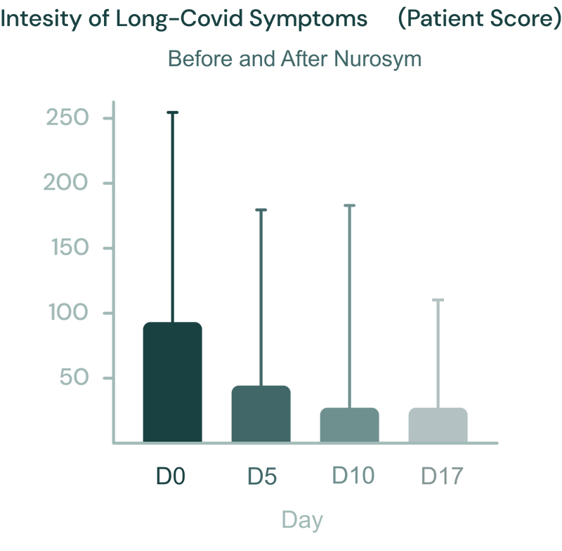 Un altro risultato di Nurosym evidenzia una significativa remissione dei sintomi post-virali, in particolare l'attenuazione del 40% dei punteggi di stanchezza cronica, nebbia cerebrale, dolore e depressione in tutti i pazienti a lungo COVID arruolati nell'indagine.