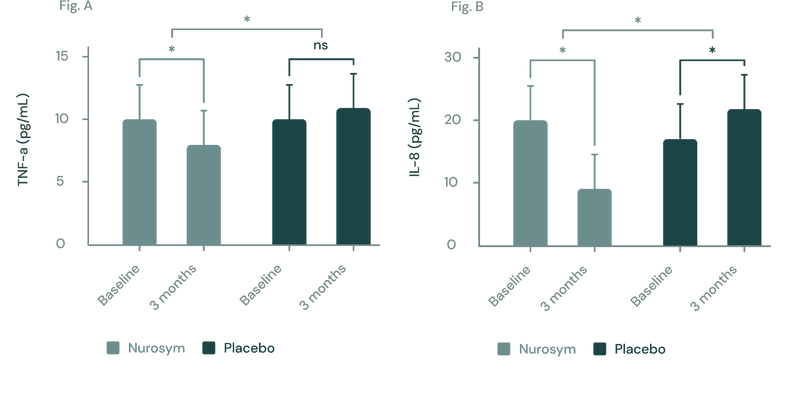 Un altro risultato di Nurosym evidenzia una riduzione del 78% dell'infiammazione in IL-6 (e altre citochine come IL-8, TNF-α). Questa riduzione dell'infiammazione è correlata a una diminuzione della percezione del dolore e a un miglioramento della funzione gastrointestinale (doi: 10.1016/j.cardfail.2022.10.278).