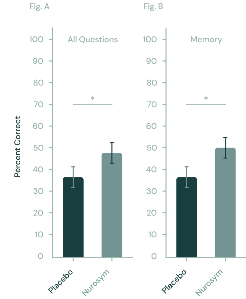 Figure (A, B). Nurosym ha dimostrato di migliorare la memoria in compiti di apprendimento rispetto al placebo. (A) In tutte le domande del test, la neuromodulazione di Nurosym ha dimostrato un notevole vantaggio rispetto al placebo. (B) In particolare, questo miglioramento era in gran parte dovuto all'impatto significativo della neuromodulazione di Nurosym sulle domande relative alla memoria (Parasym Clinical Trials, doi: 10.1016/j.brs.2020.10.012).