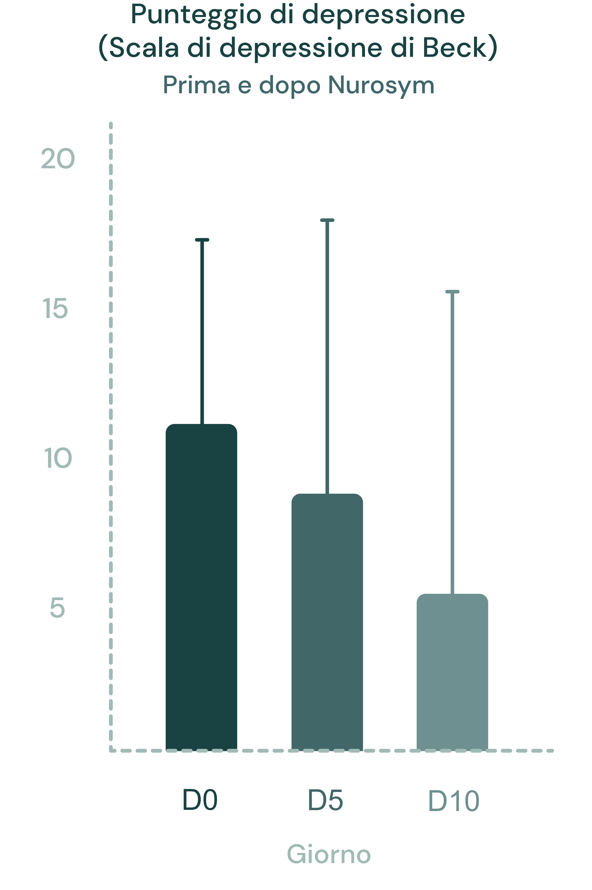 I dati presentati nello studio mostrano una riduzione statisticamente significativa del 48% dei punteggi della Beck Depression Scale dal basale (D0) al giorno 10 (D10) (p<0,05). Inoltre, si è registrato un notevole miglioramento del 185% dei livelli di IL-1ra rispetto ai punteggi medi al basale e alla visita 3. Al termine del periodo di trattamento (D10), i pazienti hanno registrato anche un miglioramento nella riduzione dei sintomi gastrici.
