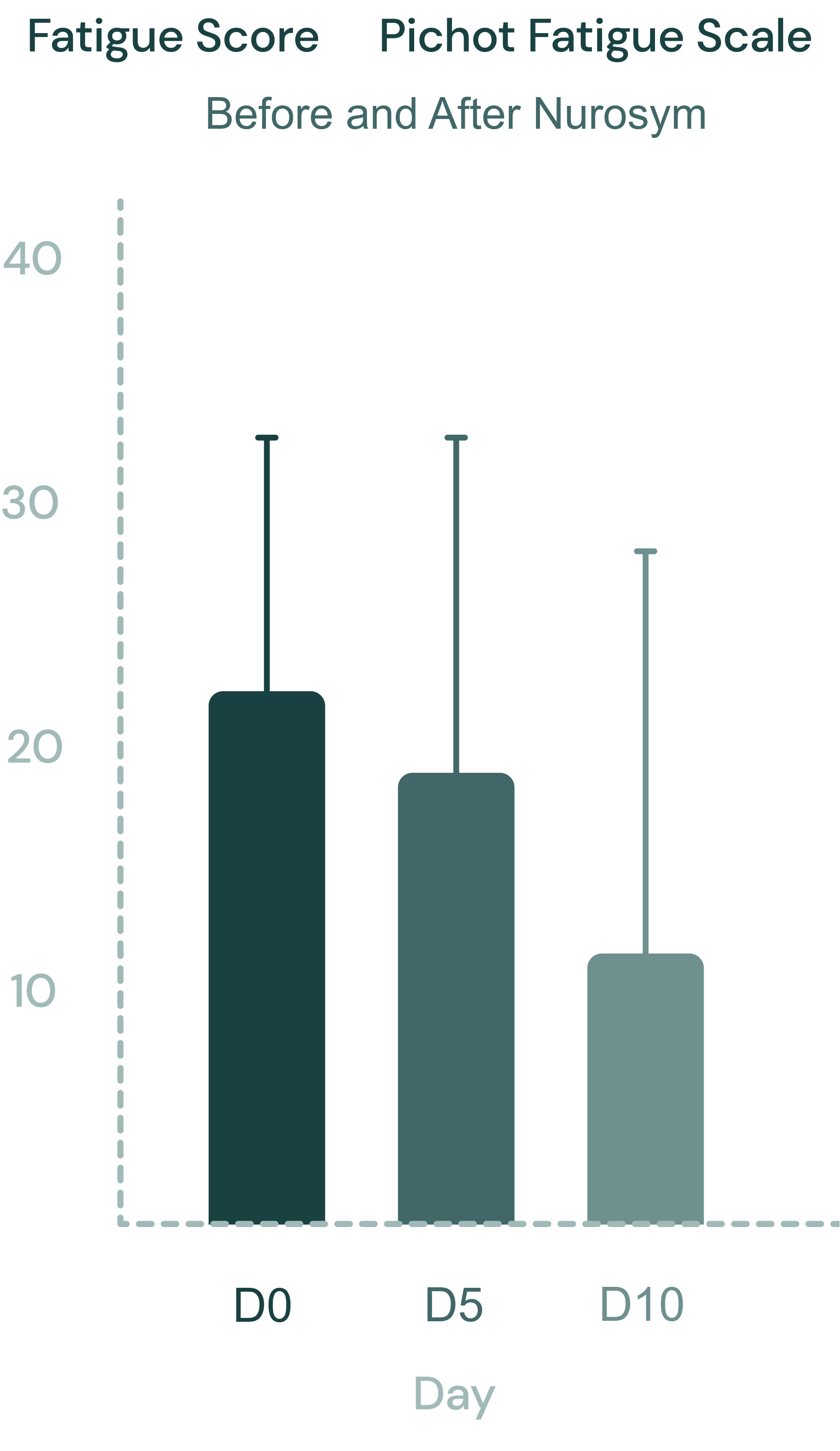 Utvecklingen av trötthet, uppskattad med hjälp av Pichots trötthetsskala under behandlingen, visade en förbättring på cirka 48% (D0 jämfört med D10, p<0,0001).