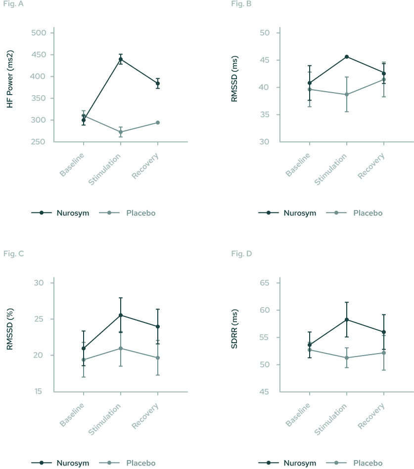 (Bilder A, B, C, D) Autonom respons på Nurosym neuromodulering visade positiva förändringar i alla HRV-parametrar (A: HF, B: RMSSD, C: pRR50, D: SDRR). Bättre effekter observerades hos personer med ett sämre initialt HRV-förhållande. En minneseffekt noterades, vilket innebär att HRV förblev förhöjt även efter att neuromoduleringen stoppats.