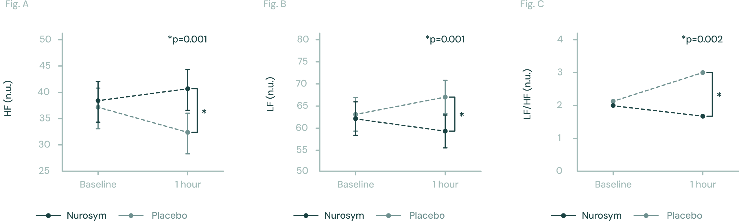 Både lågfrekventa (LF) och högfrekventa (HF) komponenter av hjärtfrekvensvariabilitet fungerar som indikatorer på vagusnervens aktivitet. LF-komponenten speglar en blandning av sympatisk och parasympatisk modulation, medan HF-komponenten, som upptäcks vid 0,15–0,40 Hz, specifikt är kopplad till den parasympatiska moduleringen av hjärtfrekvensen. Studien visade en ökning av vagusnervens aktivitet med cirka 61%, mätt med HF-komponenten (*p < 0,0017, Nurosym-neuromodulering jämfört med placebostimulering), vilket visar på betydande effektivitet.