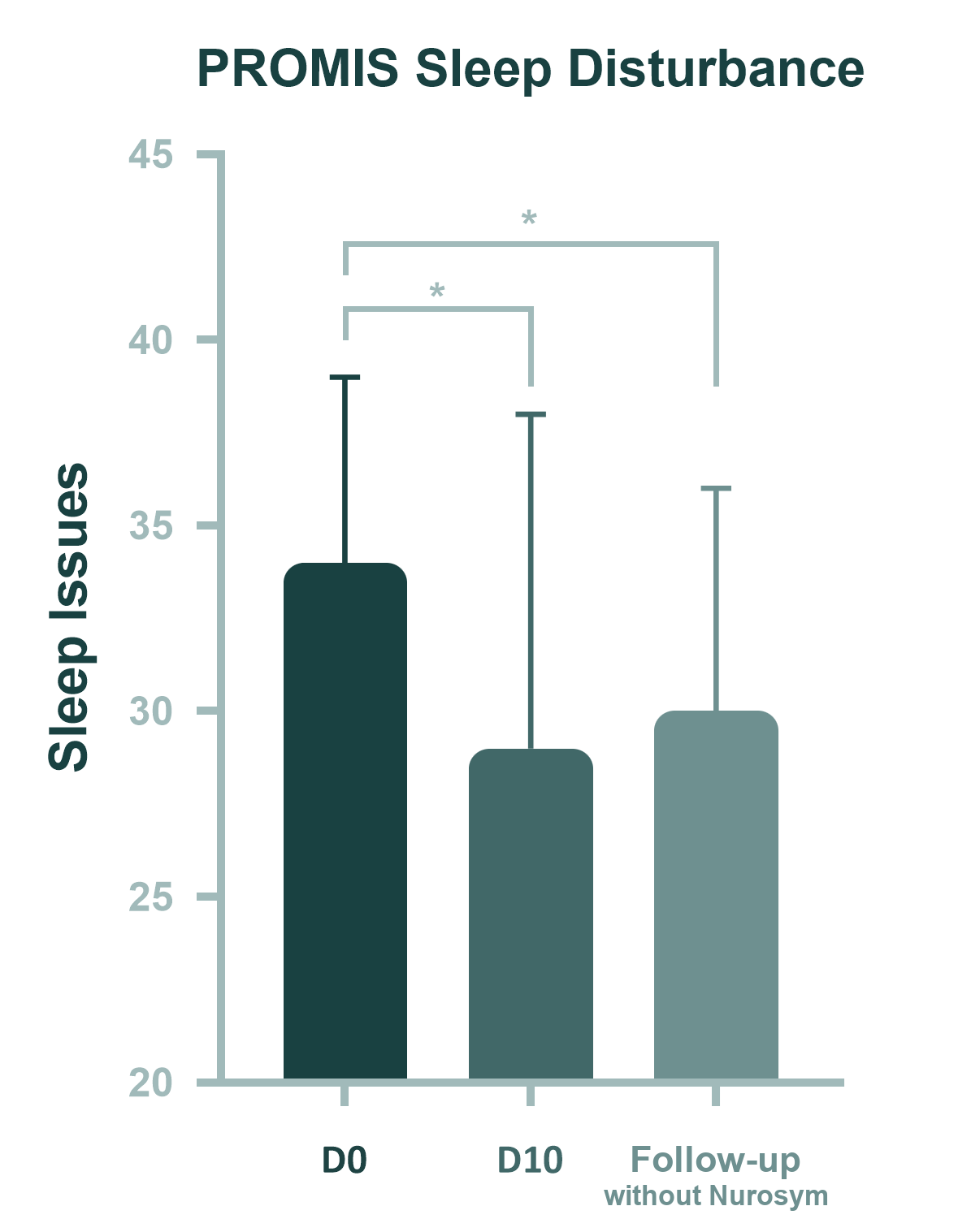 Studien visade en statistiskt signifikant förbättring av PROMIS sömnstörningsresultat i gruppen som fick Nurosym-stimulering, vilket indikerar effektiviteten av transkutan vagusnervstimulering för att förbättra sömnkvaliteten. Effekten kan korrelera med stimuleringen av vagusnerven, som tros underlätta övergången till djupare sömnstadier genom att öka den parasympatiska aktiviteten.