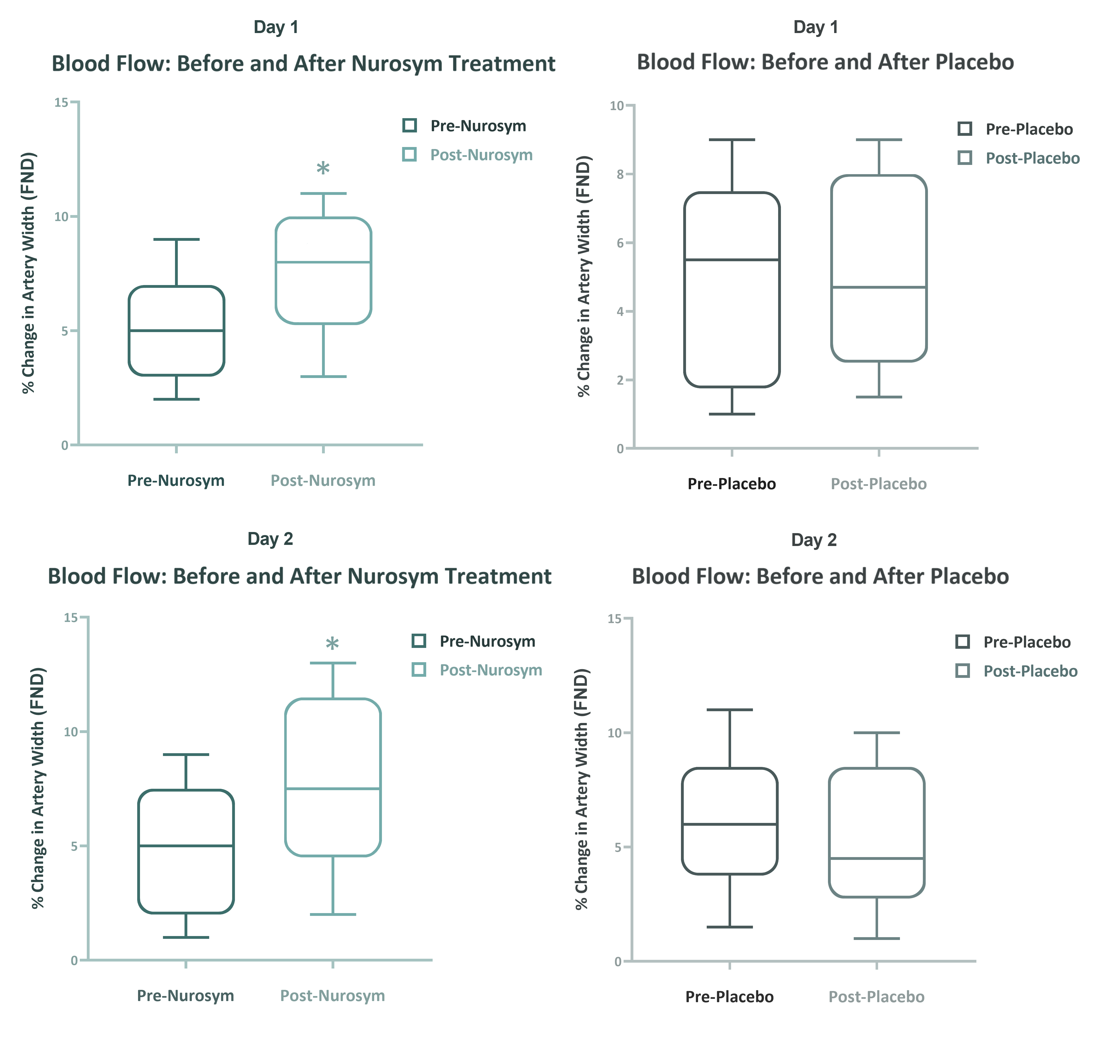 Nurosym förbättrade flödesmedierad dilatation (FMD) genom att öka den procentuella förändringen i brachialartärens diameter med 50%, vilket tyder på en signifikant positiv effekt på makrovaskulär endotel funktion (p = 0,02 på dag 1; p = 0,003 på dag 2) jämfört med placebo-stimulering (p = 0,84 på dag 1; p = 0,65 på dag 2).
