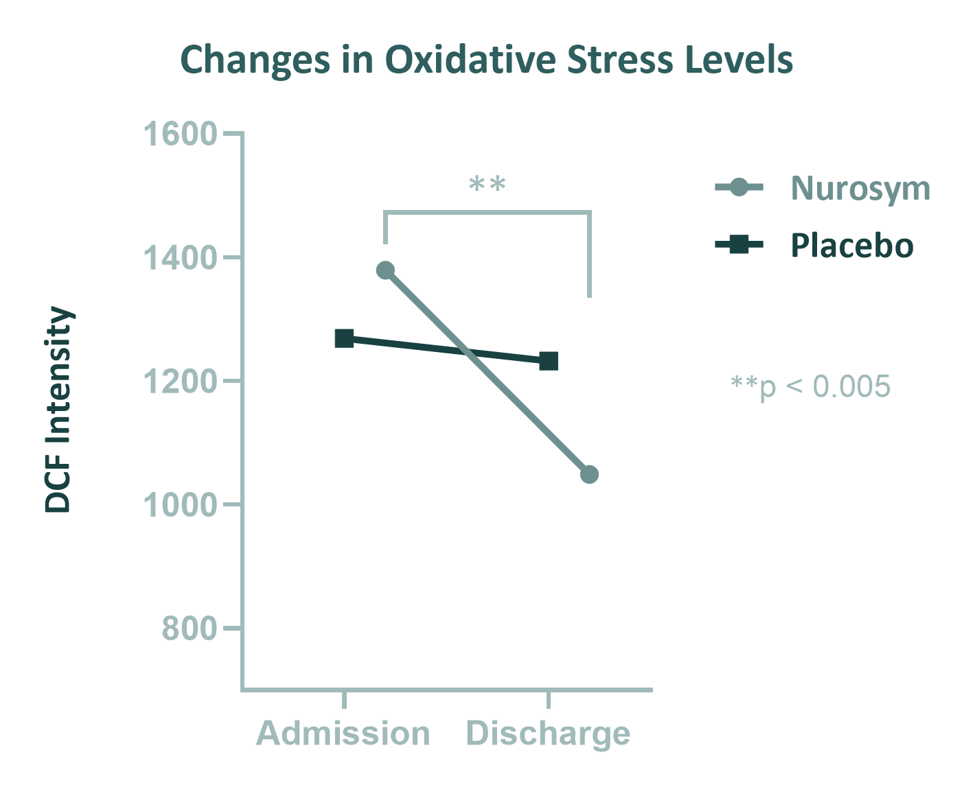 Resultaten visar att Nurosym signifikant dämpade oxidativ stress i studiepopulationen. Specifikt ledde stimulering av vagusnerven till en signifikant minskning av reaktiva syreradikaler (ROS) (Nurosym: 1363 till 978,3; p = 0,004), medan placebostimulering inte orsakade någon signifikant förändring (p = 0,10). Dessutom resulterade vagusstimuleringen i en signifikant minskning av interleukin-6 (IL-6)-nivåer jämfört med kontrollgruppen (Nurosym: -78,48 % jämfört med kontroll: -8,63 %; p = 0,012).